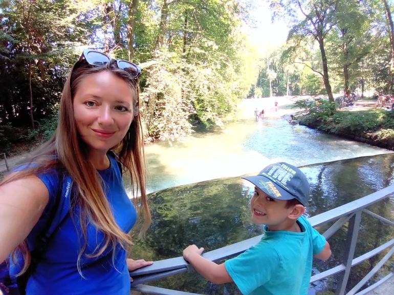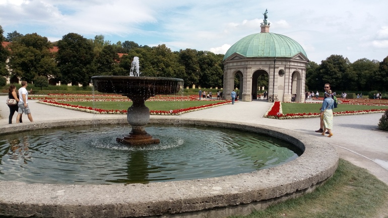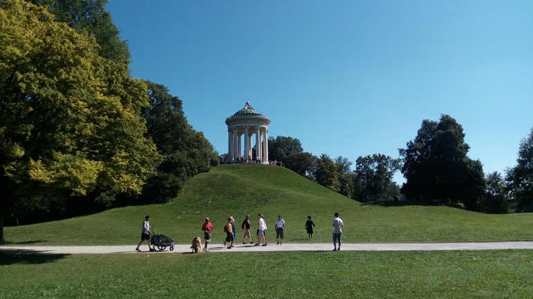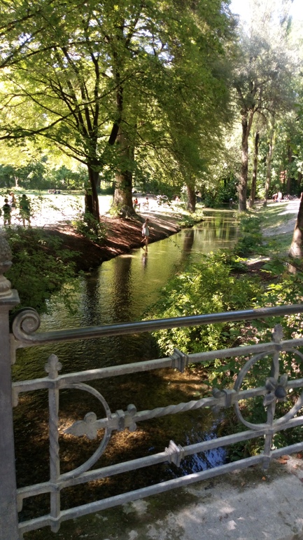 Закончили день в Английском саду, огромном зеленом парке в центре Мюнхена. Мюнхен вообще очень зеленый город с рекой Изар и большим количеством парков, жара в 30 градусов хорошо переносилась в тени деревьев.