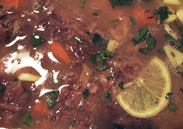 Мясо очистить от костей и кожи свиных ножек. Раздробить мясо ножом или вилкой (Только ни в коем случае не в кашу, должны быть волокна говядины) Бульон процедить.