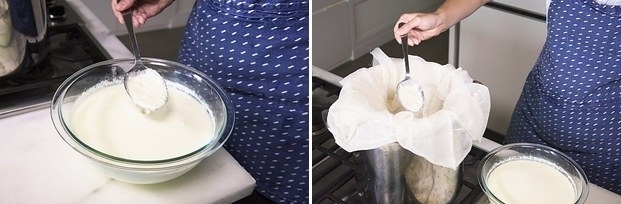 3. Вылейте оставшуюся жидкость на дуршлаг. Сырная масса, оставшаяся на марле, и есть ваша домашняя рикотта.