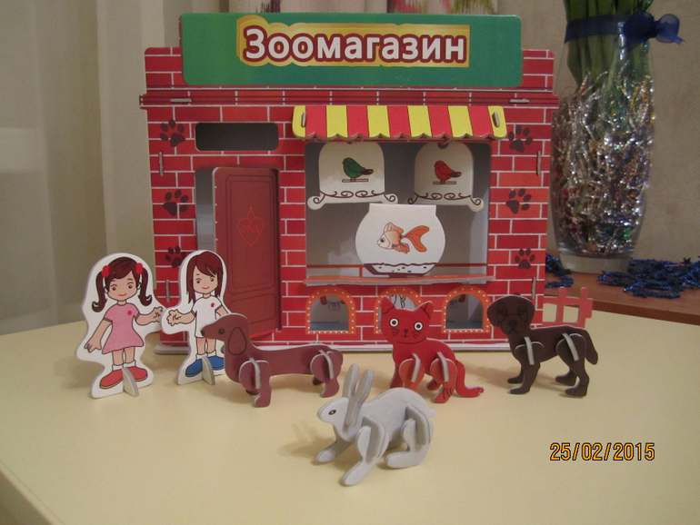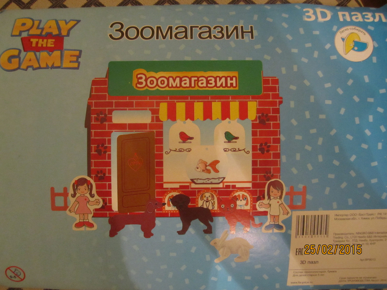 Всего за 43 руб. отличный 3D пазл "зоомагазин" (картонный). В ФиксПрайсе был еще пазл "корабль" и "Биг-Бен", теперь увидев конечный результат зоомагазина думаю взять и их) . Правда такие игрушки для детишек я думаю лет 2,5-3...которые уже могут более бережно обращаться с игрушками. Моей лапочке годик, брала на вырост!