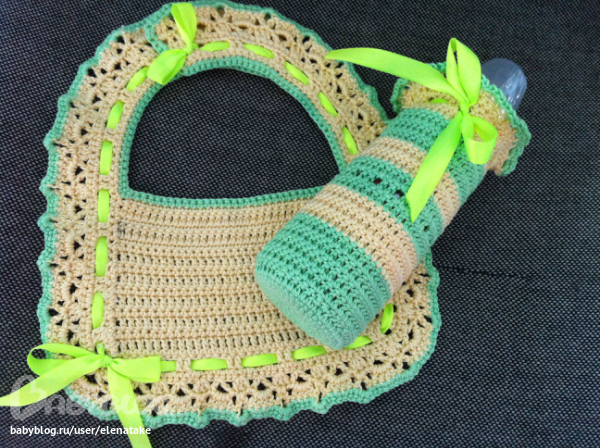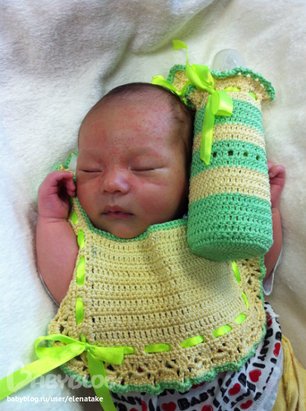 Насть, надо обязательно одевать слюнявчик, я думаю, уж совсем до неузноваемости не испачкается, ну хоть пару раз и для фото)))) А чехол для бутылочки, да, нужная вещь, себе тоже хочу связать.