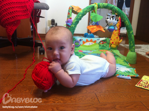 Наше кресло опять актуально, иногда лежим в нем, только теперь опустили его до пола, теперь у нас половая жизнь )))) Сынулечка мой ползает на животике отталкиваясь ножками и гребя ручками, довольно не плохо получается, довольно далеко уползает, ну а развороты так вообще мастерски. Могу сказать, что вот уже неделю мне стало намного легче, сынулька довольно долго может ползать по полу на животике, развлекаться с игрушками, на руках теперь не так часто и много, появилось время для вязания и прочего творчества. Пробую укладывать спать в кроватку, но все равно ночью беру опять к себе. А еще сынулька мой как будильник, каждое утро подъем в 5 часов, ну в будни меня это устраивает, т.к. мы и там встаем в 5, а в выходные хочется поспать подольше. Впрочем, моя умничка дает это сделать, он до 7 утра сам развлекается рядом, сегодня вот стоя на четвереньках сосал титю.