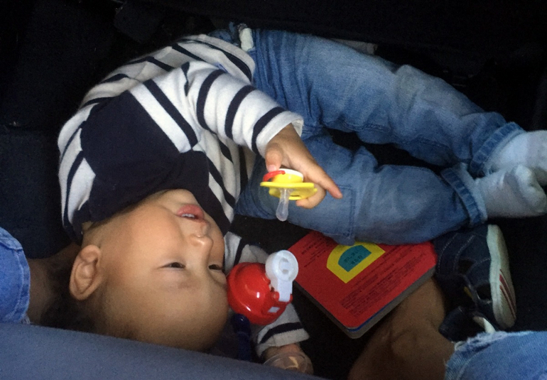 С Тогецу ездить в машине просто невозможно, этот вечный двигатель не то что в кресле не сидит, он вообще не сидит. Вот так занялся лежа в ногах на коврике.