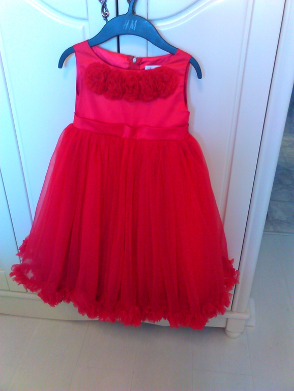 Платье с маркировкой 4,но можно носить до 6 лет,просто будет покороче.Есть затяжки и маленькая дырочка от утюга,но из за объема с фалдами незаметно.Платье очень красивое