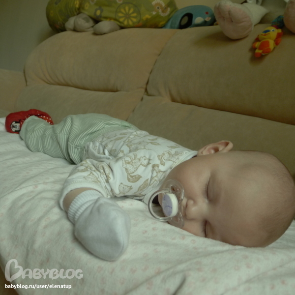 мы на животике крепче спим , чем на спине , но ночью спит только на спине..под утро можно его на животик повернуть и ещё чуть продрыхнет) . А вы ещё в царапках , мы только в первый день после РД одели - потом снимать их начал.