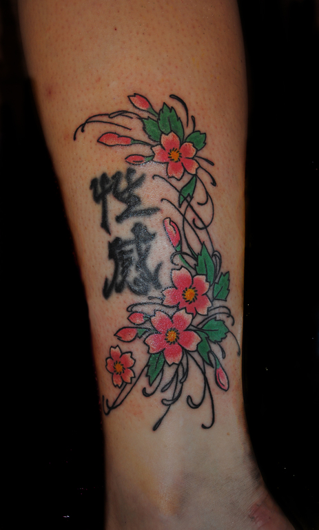 иероглифы у девушки - старая тату,которую требовалось прокрасить. Добавили красивую сакуру.