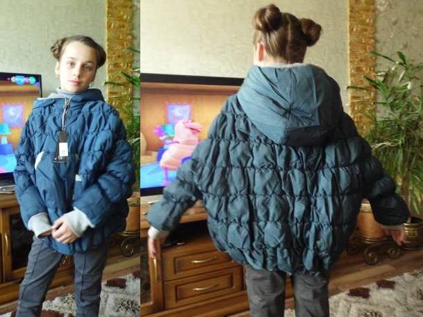 17.Очень красивая! Сидит хорошо! Куртка укороченная прямого кроя. Меховая отделка на манжетах, капюшоне и по низу изделия. Оригинальные пуговицы-кнопки по силуэту( пуховой синтепон),зима, очень теплая, несмотря на то, что тонкая и легкая!!!! ПОЛНОРАЗМЕРНАЯ!!!!!!!! На фото ребенок рост 132, куртка рост 130-свободная по ширине + есть запас по рукавам.