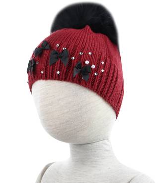 23.Шапка с помпоном из натурального меха. Изделие декорировано контрастными бусинами и небольшими вставками в виде бантиков.