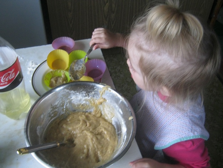 Полина помогала все закидывать и мешать. И я ей разрешила разбить яйца в миску, с чем она прекрасно справилась)