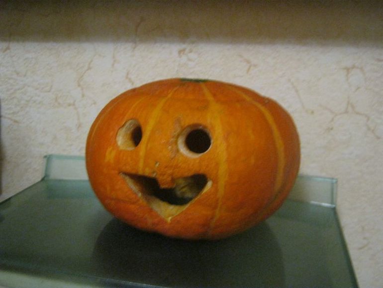 Папа нас очень порадовал и вырезал маленькую тыквочку. Просто хит сезона, дети глазели на нее весь вечер.