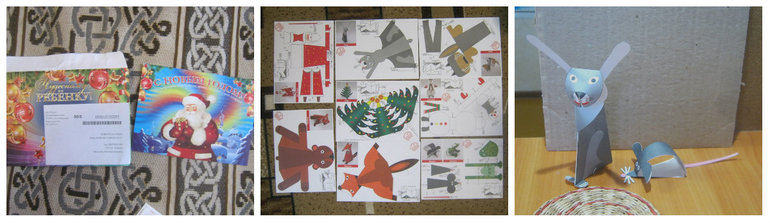 Есть такая услуга на Белпочте, можно заказать письмо от Деда Мороза и подарочек. Я заказывала письмо и творческий набор. Этих зверюшек нужно вырезать и склеивать. Парочку мы уже сделали.