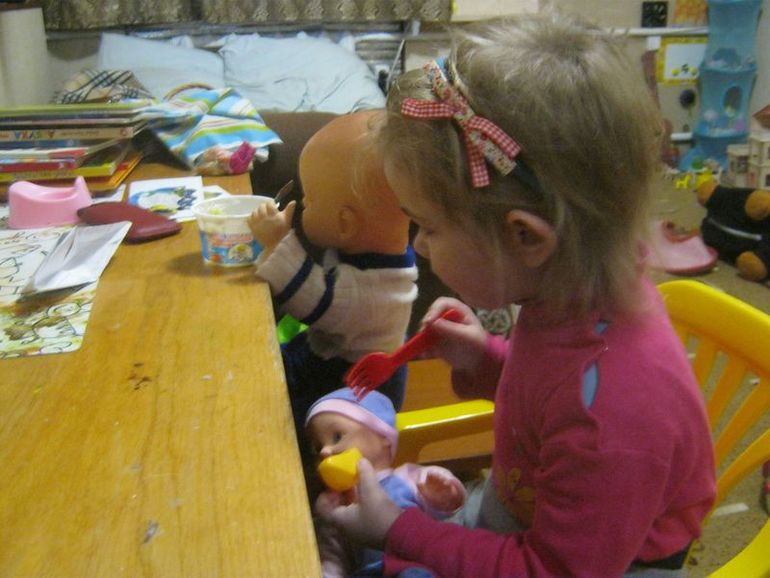 Витенька уже большой, он кушает сам - остатки недоеденного Полиной творожка. А вот Малыш еще маленький, его Полина кормит лично бананчиком.