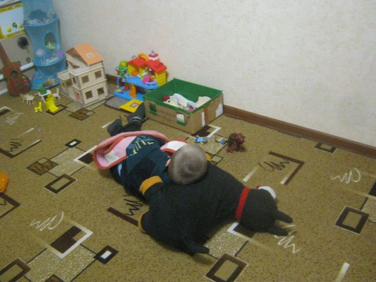 Папаша не поместился к детям, поэтому ему ничего не осталось как улечься на полу на собаке и прикрыться Полининой жилеткой.