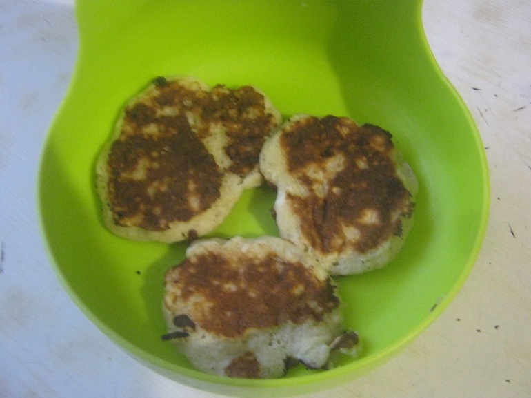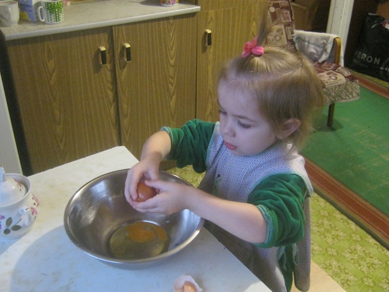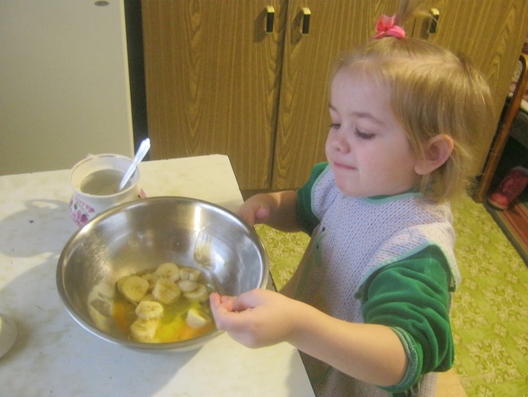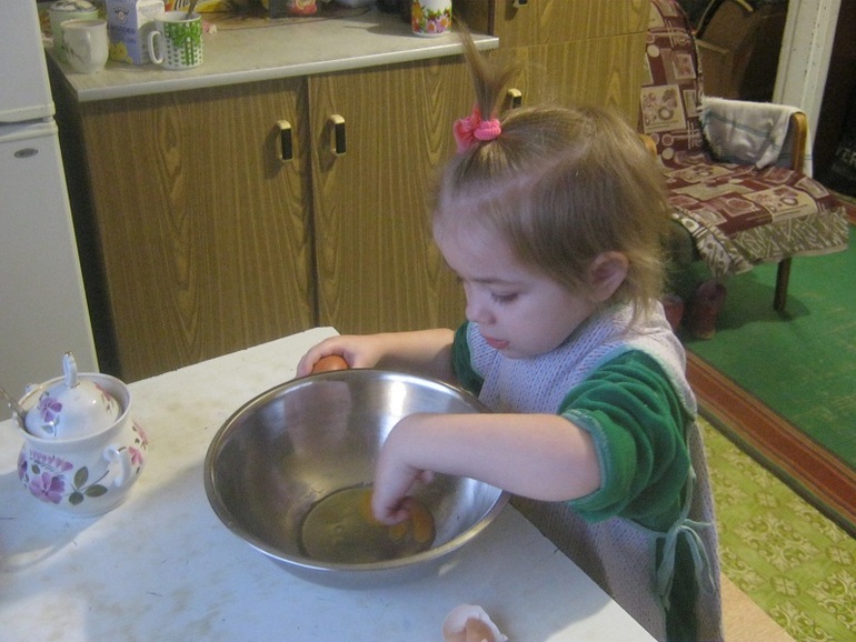 Полина разбивала яйца, мешала чуток и самолично сбегала за мукой, набрала и всыпала ее, когда я решила, что тесту чего-то не хватает. А еще стояла на стуле и помогала накладывать тесто в сковородку.