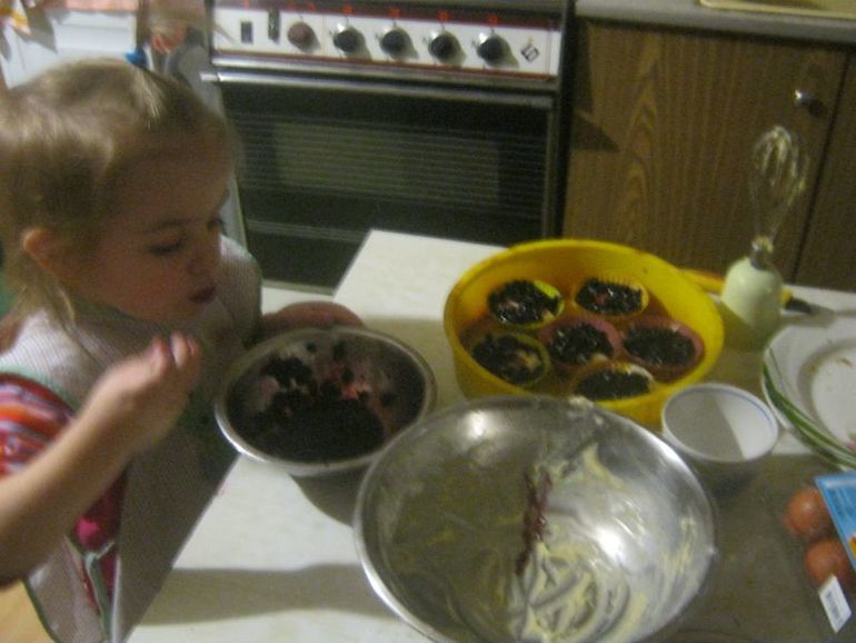 Теста получилось очень мало, на нашу форму явно не достаточно, поэтому мы сделали в формочках для кексов. Получилось 6, но можно было и 7, потому что кексы выросли, а Полина слишком много наложила и теста и черники. Даже формочки не смазывала, потому что в тесте было достаточно масла. Отстали хорошо.
