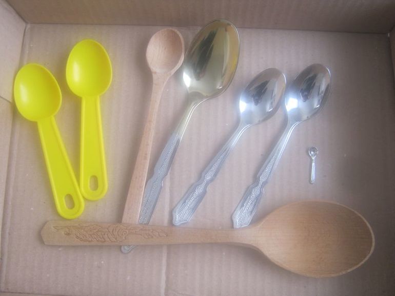 10. Еще у нас была коробочка с ложками. Получилось задание на логику, я задавала вопросы, а Полина бодро отвечала: какая ложечка самая маленькая, самая большая, какая железная, деревянная, пластмассовая, кто будет есть маленькой ложкой, какие одинаковые и т.д.