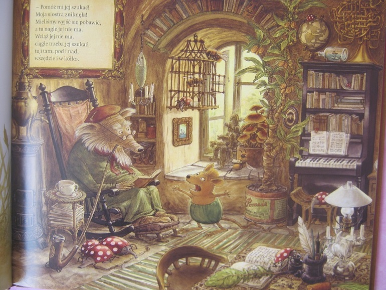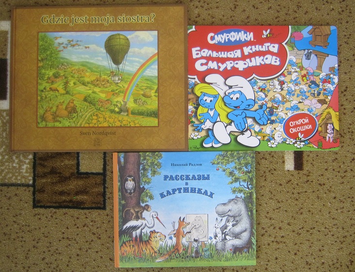 Кратко об этих книгах. Вот вспомнили про Кротика, почитали две книжки. Кротик в городе моя любимейшая книга детства, я на ней оттачивала свое мастерство скорочтения, а уж картинки смотрела очень много раз. Марусю тоже вспомнили, у нас наверно все книги серии собраны и периодически мы возвращаемся к ним. Хочу к маме выбрала я, захотелось чего-то эдакого дональдсоновского) И дочка одобрила, как она светится когда обезьянка находит папу и маму) Здоровская книжка! Петсона и Финдуса тоже не забываем. Кстати, я заметила, что дочка с возрастом осиливает все большие и большие отрывки текста, если в одних и тех же книгах я успевала только пересказать сюжет, пока она смотрит картинки, то теперь она может слушать что я читаю медленно) Книги с окошками очень востребованы у Полины, особенно если речь идет о любимых героях, вот как в этой про Смурфиков. И прекрасная книга в нашей коллекции «Где моя сестра?» Свена Нурдквиста на польском с совершенно потрясающими фантастическими иллюстрациями. Ее можно рассматривать снова и снова и всякий раз найдется что-то новое и ранее незамеченное.