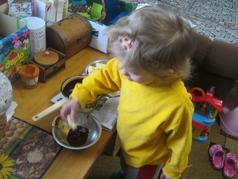 Я достала давным-давно запрятанные кукурузные палочки. Ну а дальше мы наперегонки обмакивали палочки в шоколад) Очень вкусно!