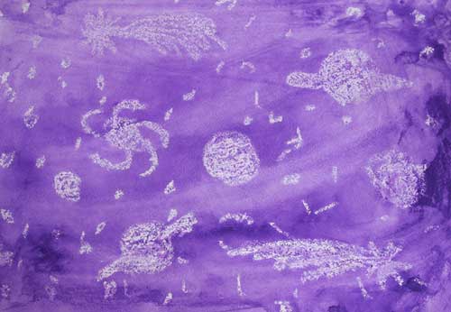 Нарисовать на листе свечой или белым восковым мелком космические объекты и дать потом раскрасить ребенку краской.
