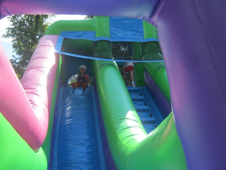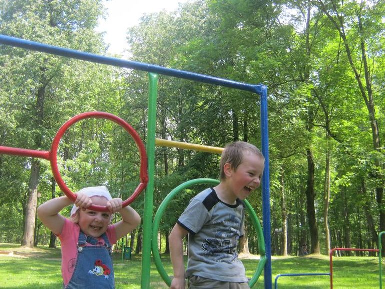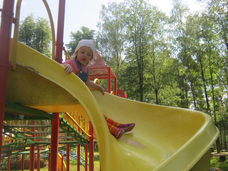 Полина не боится высоты, смело лезет и с радостью съезжает. А если там еще и встретился двоюродный брат... то радости нет предела.