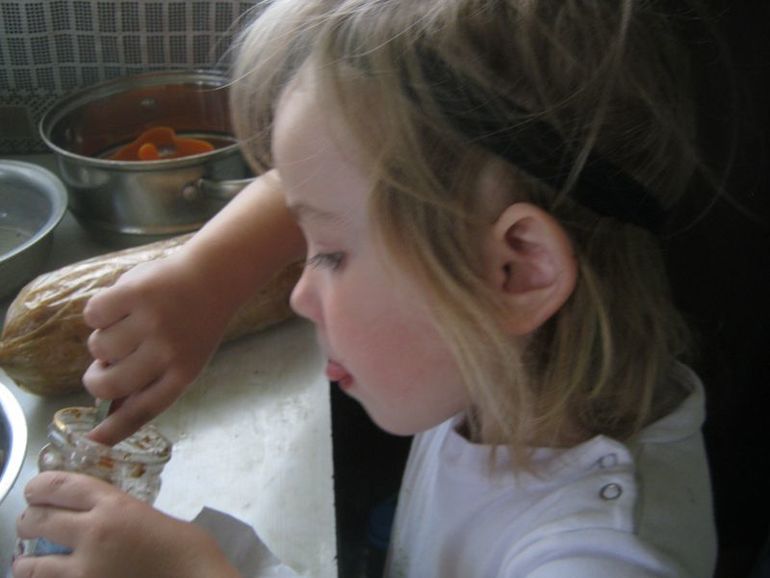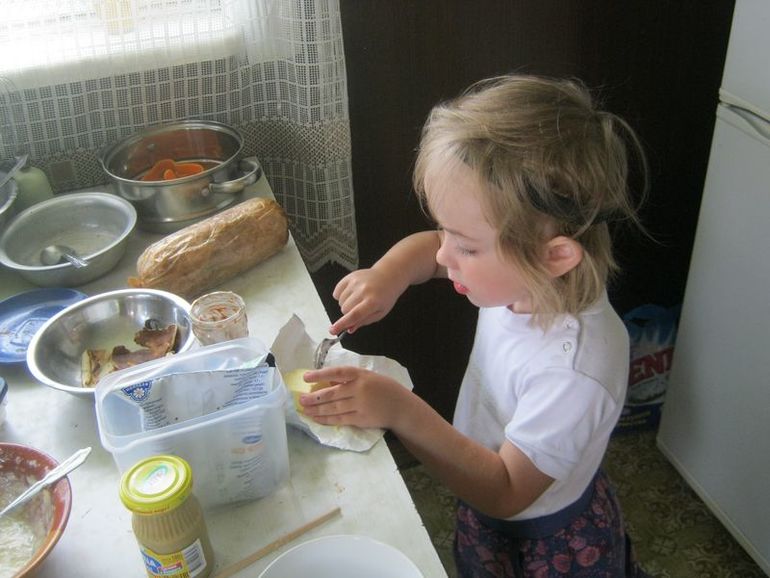 Дома Полина добывала себе пропитание, возилась с куском масла и пыталась выковырять остатки нутеллы из банки.