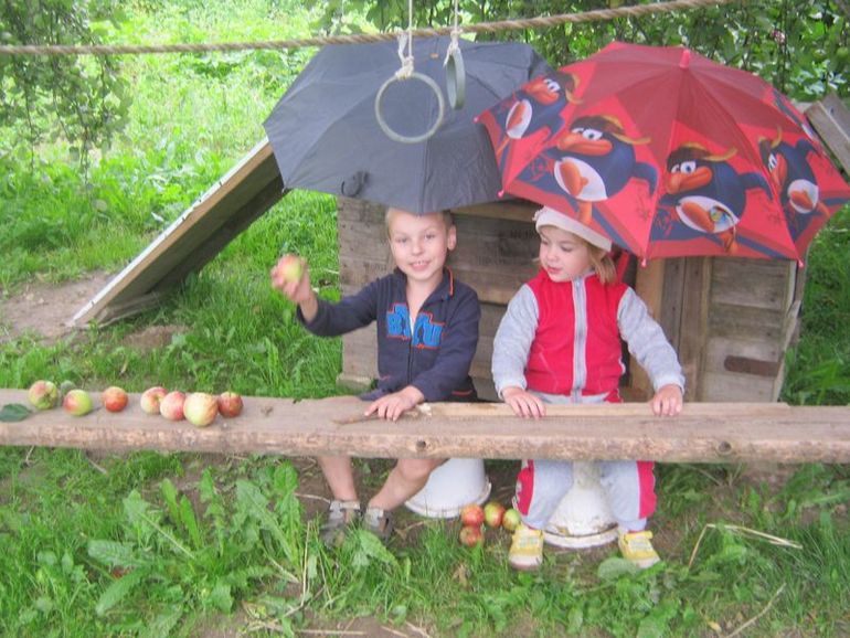 Антон с Полиной вечером организовали мини-рынок и зазывали покупателей за яблоками. Очень забавно (нам пришлось их покупать, между прочим), вдвоем очень весело проводить время))