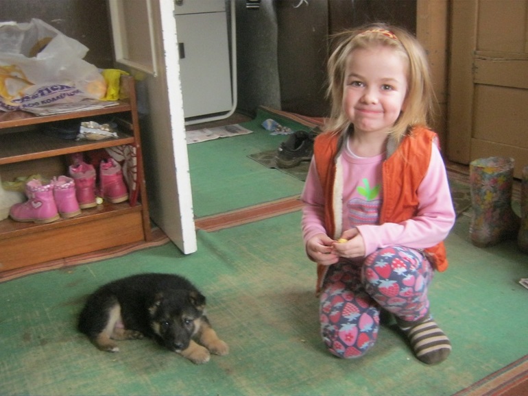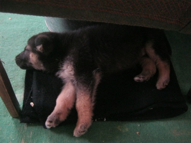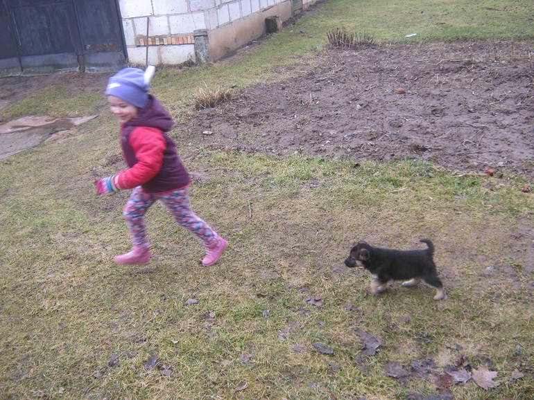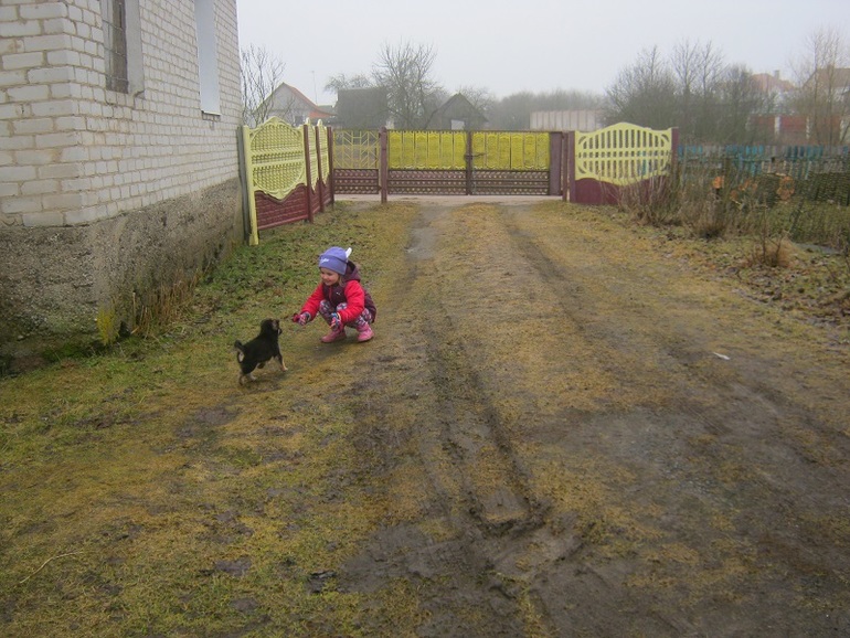 Собачке ровно 1,5 месяца. В принципе я бы сказала довольно таки сообразительный. Дети довольны, но поиграют и занимаются своими делами, и только я дежурю. Скоро на кухню переселюсь. Потому что днем дома он в кухне-прихожей. Одно только радует, что он много спит.