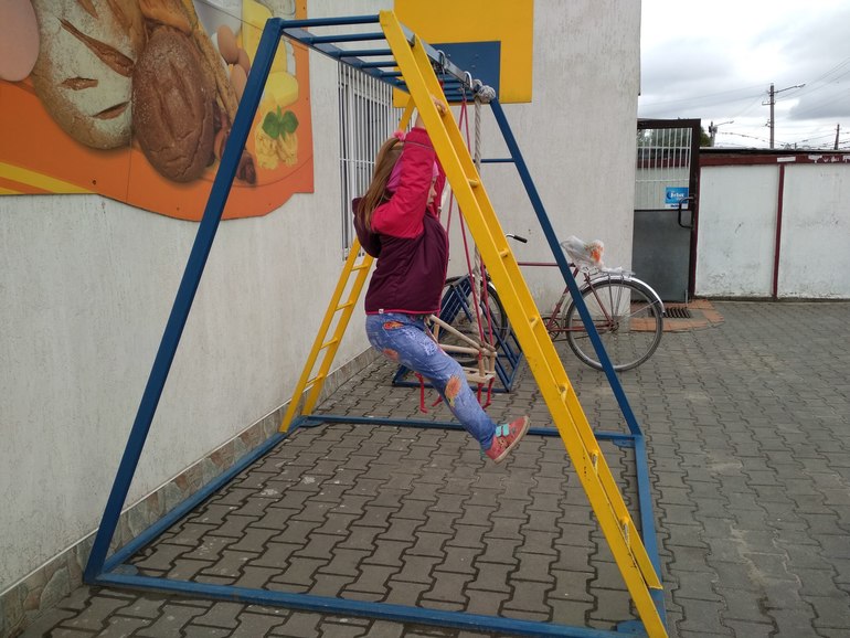 Полина разжилась щелкающей ручкой со смешариками и раскраской с троллями. Показывала как нужно висеть на перекладине.