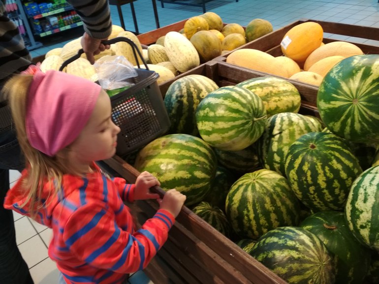 Еще мы съездили по секретному делу, о котором я напишу попозже, а потом в Евроопт с дедушкой. Полина вошла в магазин, с важным видом прошлась мимо тележек и сказала, что "я в них уже не помещаюсь", и пошла пешком. Арбузик мы конечно купили)