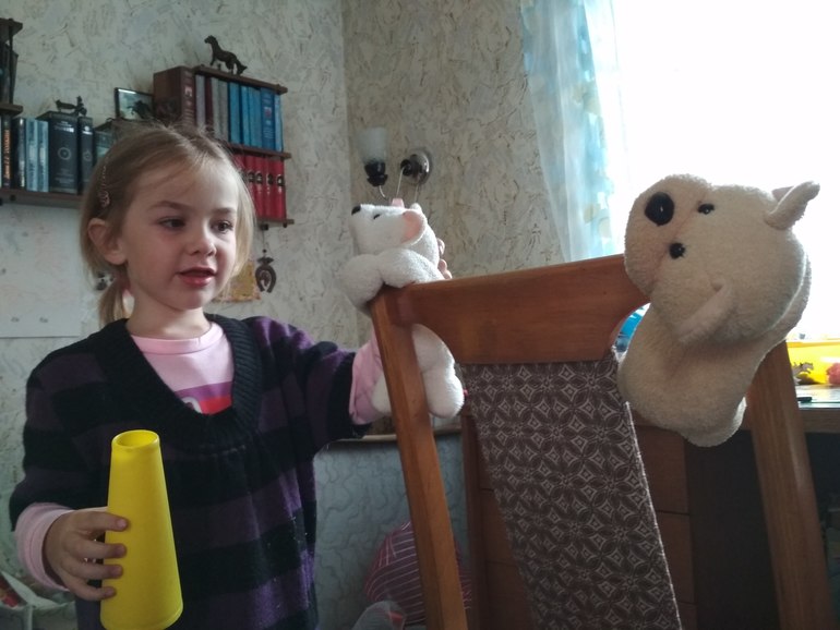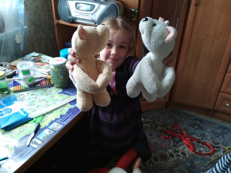 Играли с Полиной, кстати не очень то и тепло, я одеваю ей свою старую жилетку, ей тепленько и мне спокойно. Ну и новость дня: Неразделяльные медведики очень даже разделяльные.