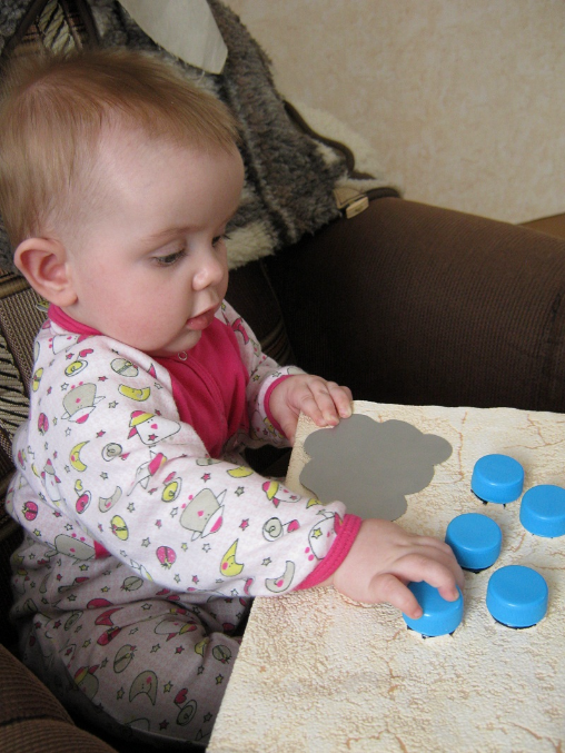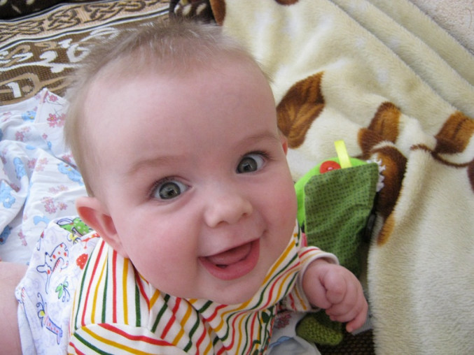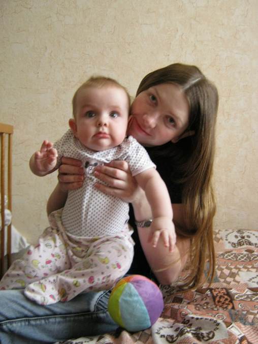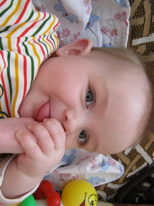 За месяц у нас три главных события: встала на четвереньки, вылез зуб, и так сказать, укрепление сидячего положения. Сама не садится, но как посадишь, может долго сидеть и даже без опоры. Кушаем уже в стульчике, и в ванночке немного сидим. Другое: научилась цокать языком, обнаружила, что тюль и шторы отлично тянутся, достает вещи с полки над диваном (40 см) одной рукой. Не ползает, но активно перемещается.