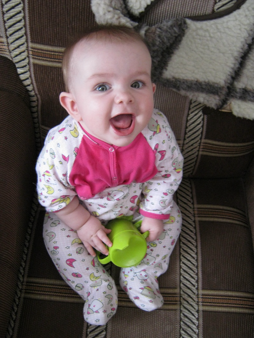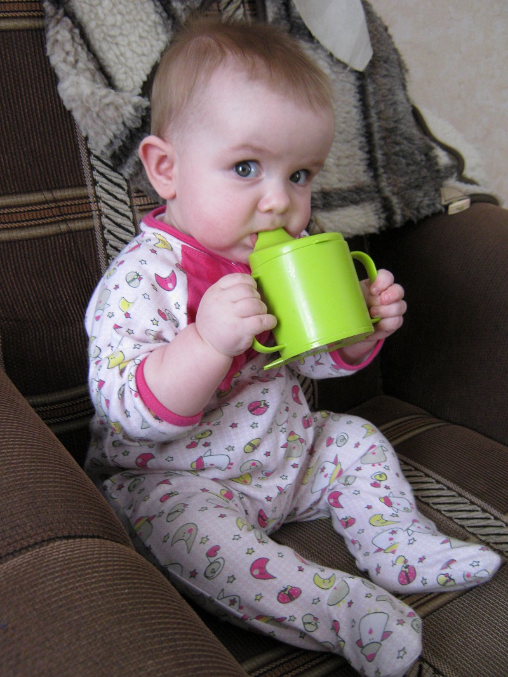 Состоялось знакомство с поильником. Потому что она полюбила пить воду. Когда я ей чищу ротик (бинт на палец), она жадно вытягивает всю воду. Даю ей пока около 20 мл обычной кипяченой воды. А поильник ей понравился. Немного, правда, пообливалась. Еще долго с рук его не выпускала, даже когда вода закончилась)