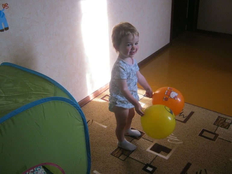 Посреди комнаты стоял домик-палатка с подарочками внутри, а воздушные шарики были раскиданы тут и там. Что там домик, что подарки, главное, что шарики были)))