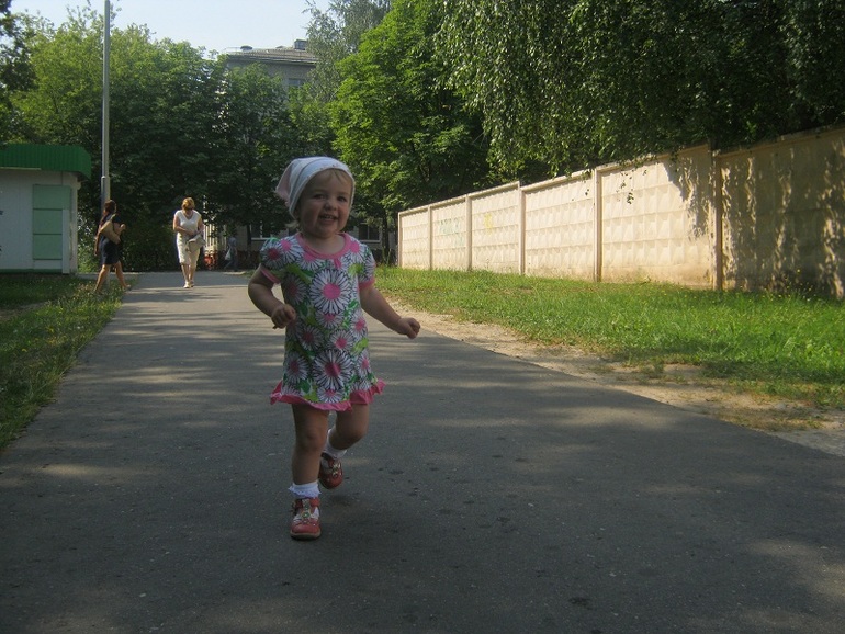 А вот уже через 2 года она весело бегает по дорожке)