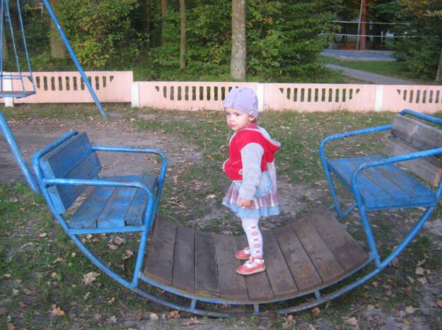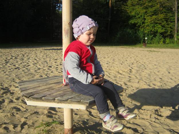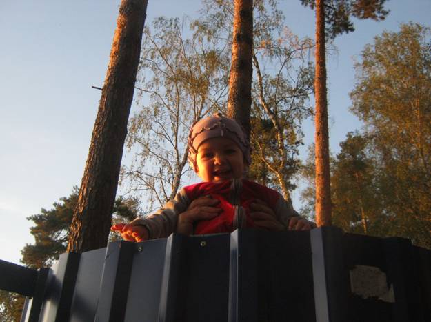 Горка была покорена Полиной в последний день. Сначала дед ее садил и помогал съезжать, потом мы вместе катались. И вдруг она меня отводит в беседку и говорит сидеть, а сама идет и лезет на горку. И вот она САМА умеет съезжает с горки. Только я сверху дежурю, а дед снизу)