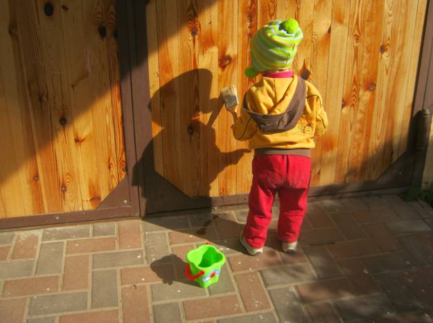 Гуляли даже когда фонари зажглись. Очень разыгралась со Стасиком, убегала от него с веником, а он догонял ее, толкая перед собой камаз.