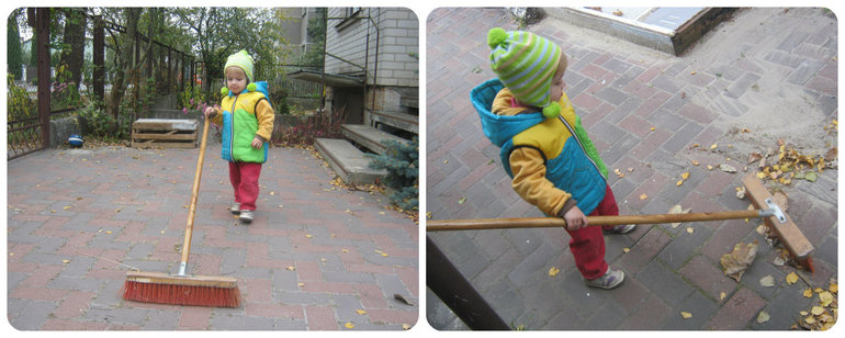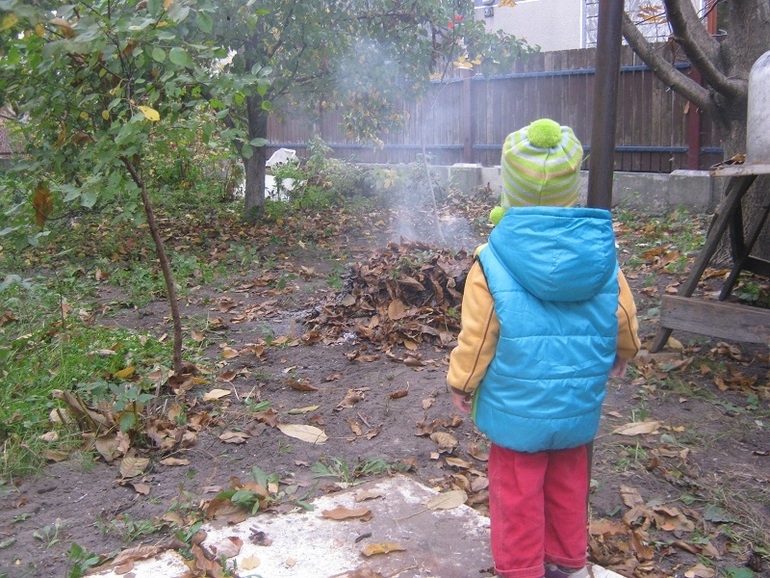 Поучаствовала в осенних работах, помогала подметать двор и смотрела как горят листья.