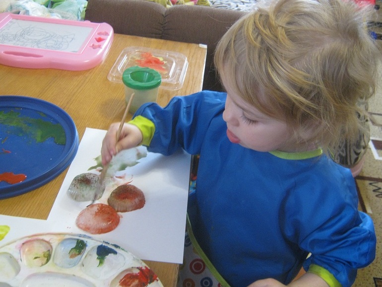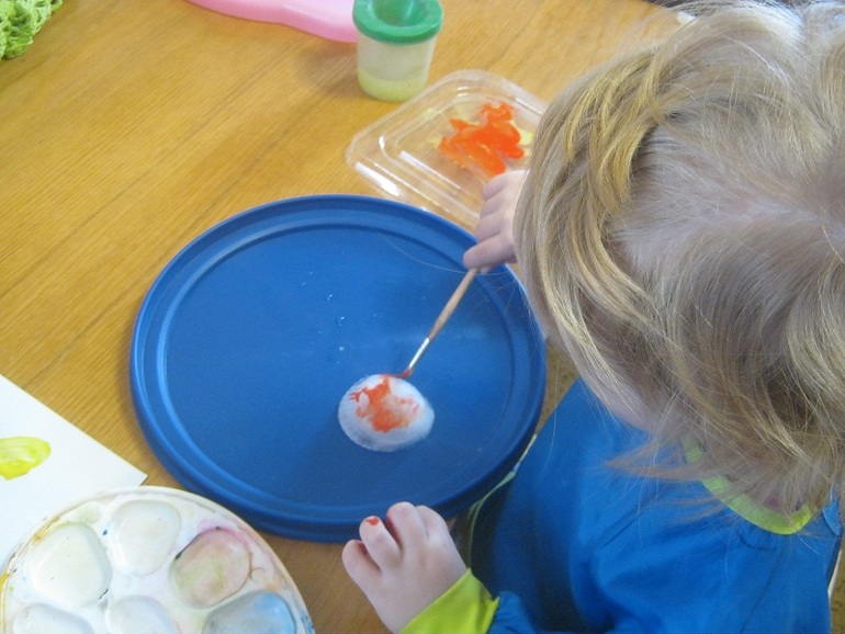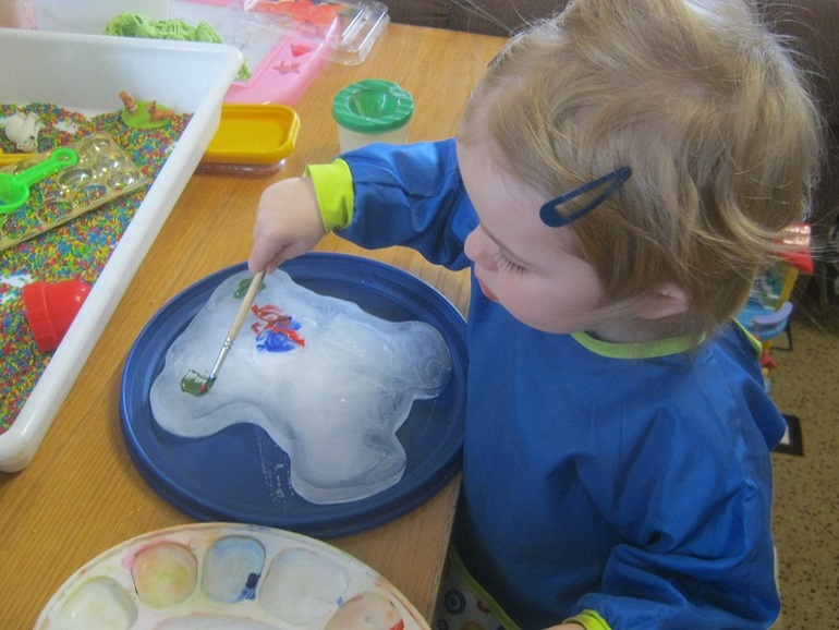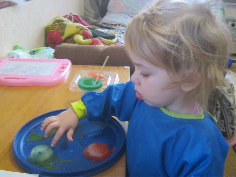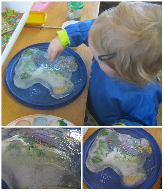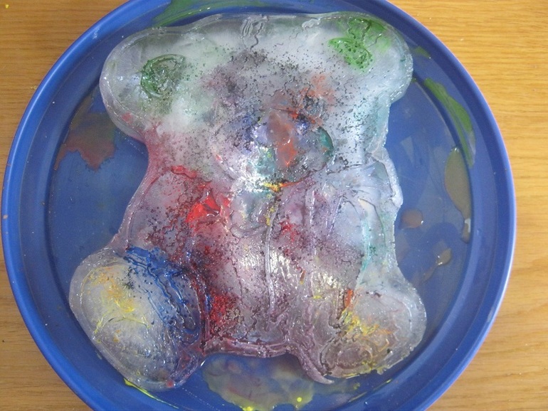Растянули на два дня, сначала пробные маленькие ледышки из формочек для кексиков. Полина в восторге, требовала еще лед, усердно посыпала краску солью.