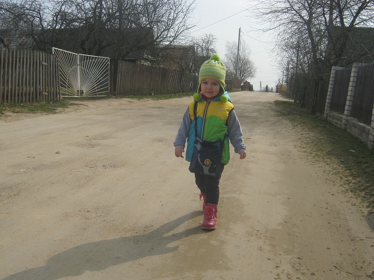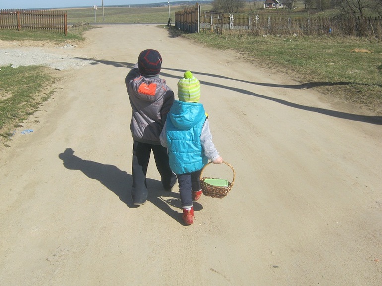 Потом пришли, переоделись, покушали и опять пошли. Пошли мы святить яйца)) В церковь нам идти не надо, у нас особый случай, потому что приезжает закрепленный за нашими деревнями батюшка, и нужно в нужное время подойти к нужному месту. Дети шли очень бодро туда.