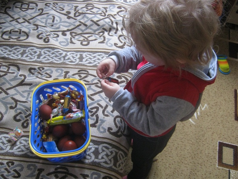 Полина всем рассказывала, что она идет на Пату (на Пасху), в корзинке тафенты (конфеты), и это мой бьят Атон. Человек собралось около 50, много детей. Полинка вела себя очень хорошо, все смотрела и спрашивала.