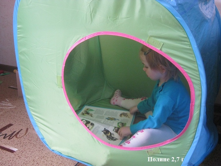 А вот, не дождавшись мамы, уложила куклу и «читает» ей)