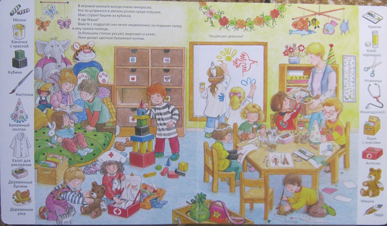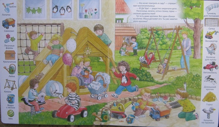 Вообще-то это как бы два в одном: рассматривание и обсуждение сюжетов из садиковской жизни и поиск предметов. Текст тоже есть, но его совсем мало. Иллюстрации очень милые, добрые и красивые. Листы картонные плотные, всего 5 разворотов, по краям листов изображения предметов, которые можно называть (собственно учить новые слова) и можно и искать на картинке. Передняя и задняя обложки это тоже самостоятельные листы, которых нет в книге и которые можно рассматривать. Итак, на первом развороте дети приходят в сад, переодеваются, на втором они играют, рисуют, мастерят. На третьем кушают и посещают умывальники и туалет. На четвертом детки гуляют, катаются на качелях с горки, копаются в песочнице. На пятом снова игровая, где они переодеваются в костюмы, поют и играют на музыкальных инструментах. Мне лично не хватило сцены с укладыванием спать. Моей дочке книга понравилась, она даже задумчиво сама ее листает, морально готовится идти в сад, наверно)