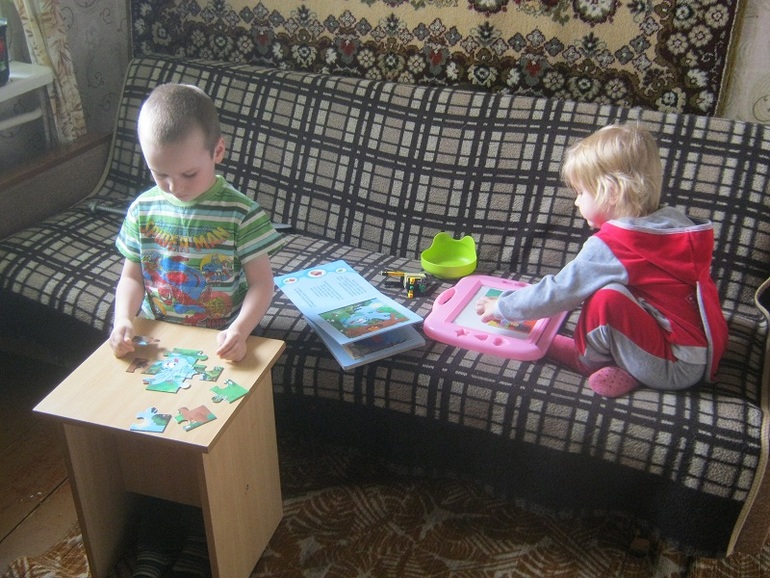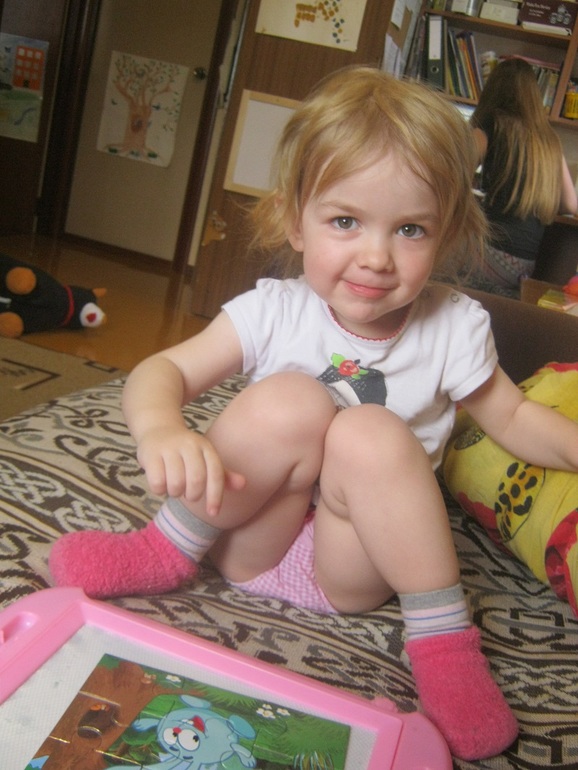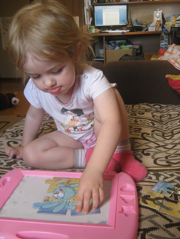 Полина уже уверенно складывает все пазлы из 9 штук, теперь у нее их 8. Антона тоже приучаем, он старше ее, ему 4,10 года, но пазлов в глаза не видел. А тут справился легко и с 6 и с 9 штук.