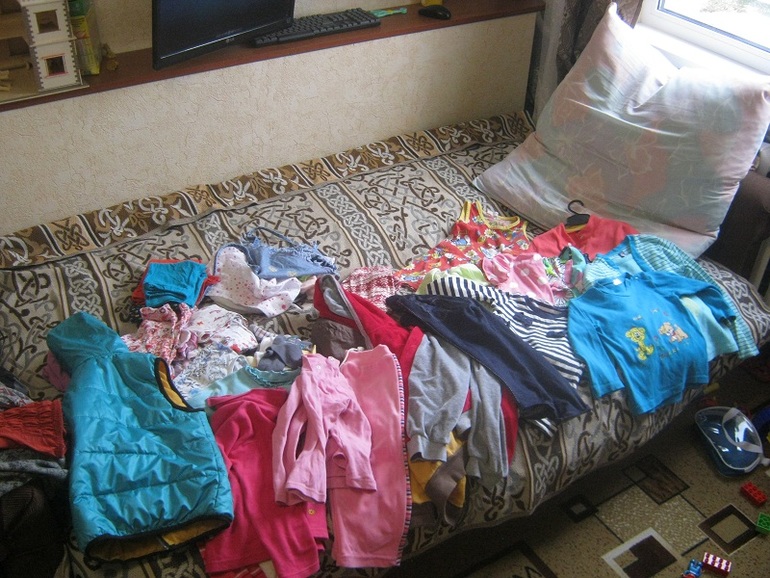 Аааа, целый чемодан Полиныных одежек будет, а что я беру? Пару кофт, пару штанов, пару колготок, трусов, маек, платьев, носков куча. Блин, это же что-то записяется, что-то вымажется, что-то в стирке будет. Не знаю, что и выкинуть.