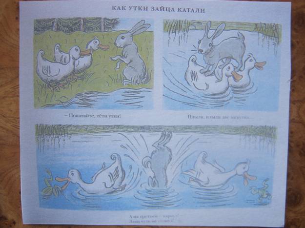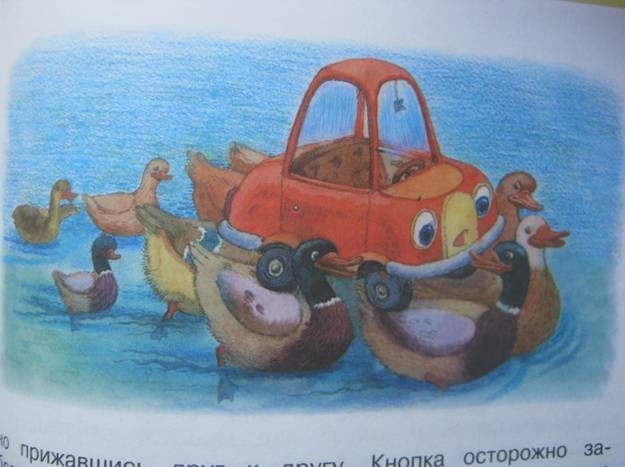 Вчера же мы рассматривали картинки к рассказам про маленькую машинку Кнопку и увидели такую вот картинку. Я обратила внимание, что прямо как из нашего стишка про зайца и уток, ну а Полина тут же рассказала свою версию!