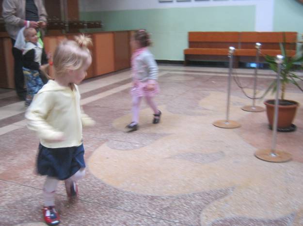 Мы пришли слишком рано, в фойе есть столик, там игрушечки, и сидит женщина. Можно подойти, она мило беседует с детками. Полина ей с восторгом рассказывала об огромных игрушках, которые служат украшениями и висят по стенам: медведи, гномы. А под потолком огромный воздушный шар, который поразил Полину больше всего.