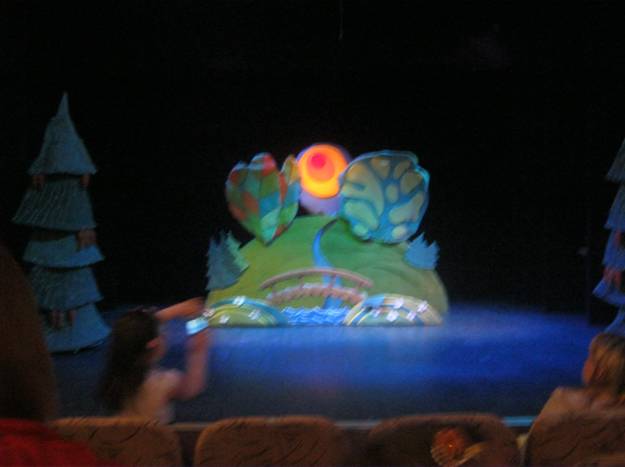 На сцене были декорации: елочки, дальний лес, мостик, речка.