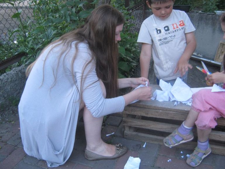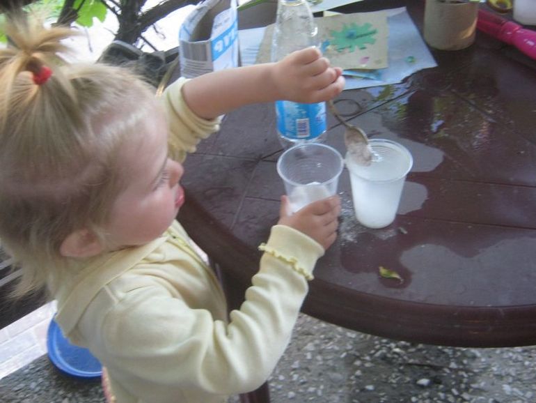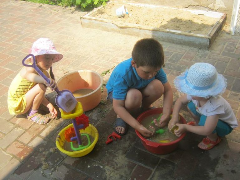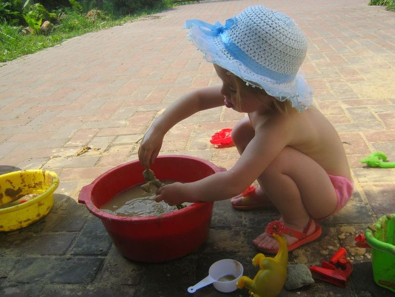 В субботу мы во дворе, было очень жарко. Я налила воды в тазики, пришли детки, и они часа два играли в эти тазики! Просто кидали туда песок, месили грязь и возились.