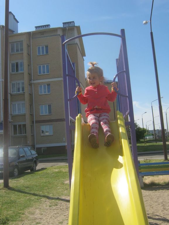 Сначала у Стасика во дворе, потом я показывала детям опыты с водой, а потом отправились к Глебу во двор. На сей раз я была спокойна, потому что Глеб был с няней, а с нами еще пошли Стасик с мамой. Полина хитренькая, пока Стасик и Глеб скакали на батуте, она оббежала все «аттракционы» и поиграла игрушками.