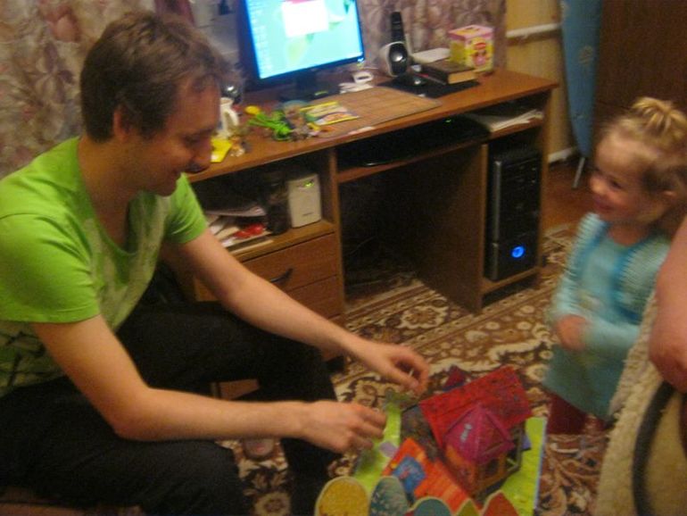 Вечером так и не вышли, приходил Валера. Полина сначала его очень ждала, но потом убежала, играла в корабль и громко кричала нам «ТИХО!». Поэтому ее пришлось усадить за мультики. Но потом она разошлась, таскала Валере свои игрушки и показывала дом монстриков и играла с ним (с домом играла).